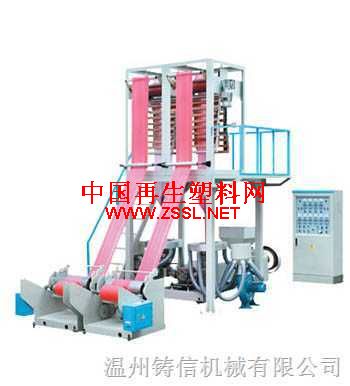 SJ-60(70) 单螺杆双模头吹膜机组 用途特点: | 用于吹制各种低密度聚乙烯(LDPE)、高密度聚乙烯(HDPE)和线型低密度聚乙烯(LLDPE)等塑料膜。广泛应用于食品、服装纺织品、日用品和工业品的包装。 1、该机采用单螺旋杆挤出,双摸头出膜,配以双牵引、双卷取装置具有高产低耗的特点。 2、螺杆、料桶均采用38CRMOALA合金钢,经氮化处理和精密加工而成,硬度高,耐腐蚀性强,经久耐用。 3、模头镀硬铬,其结构为螺旋芯轴式,挤出的熔融料均匀,吹制的薄膜光洁度好;风冷装置结构为迷宫型,出风量均匀。 4、卷取装置采用压力摩擦收卷,或中心收卷,采用力矩电机调节,收卷平整、换卷方便。 | 技术参数: | 型号 | SJ-60 | SJ-70 | 螺杆直径 | φ60 | φ70 | 薄膜折径(mm) | 200-500 | 200-600 | 薄膜单面厚度(mm) | 0.005-0.05 | 0.005-0.05 | 螺杆转速(rpm) | 10-120 | 10-120 | 长径比 | 28:1 | 28:1 | 主电机功率(kw) | 18.5 | 22 | 加热功率(kw) | 23 | 25 | 产量(kg/h) | 40-50 | 40-60 | 外形尺寸(mm) | 6200×3000×3200 | 6500×3200×3300 | 机重(T) | 2.3 | 2.5 | | |